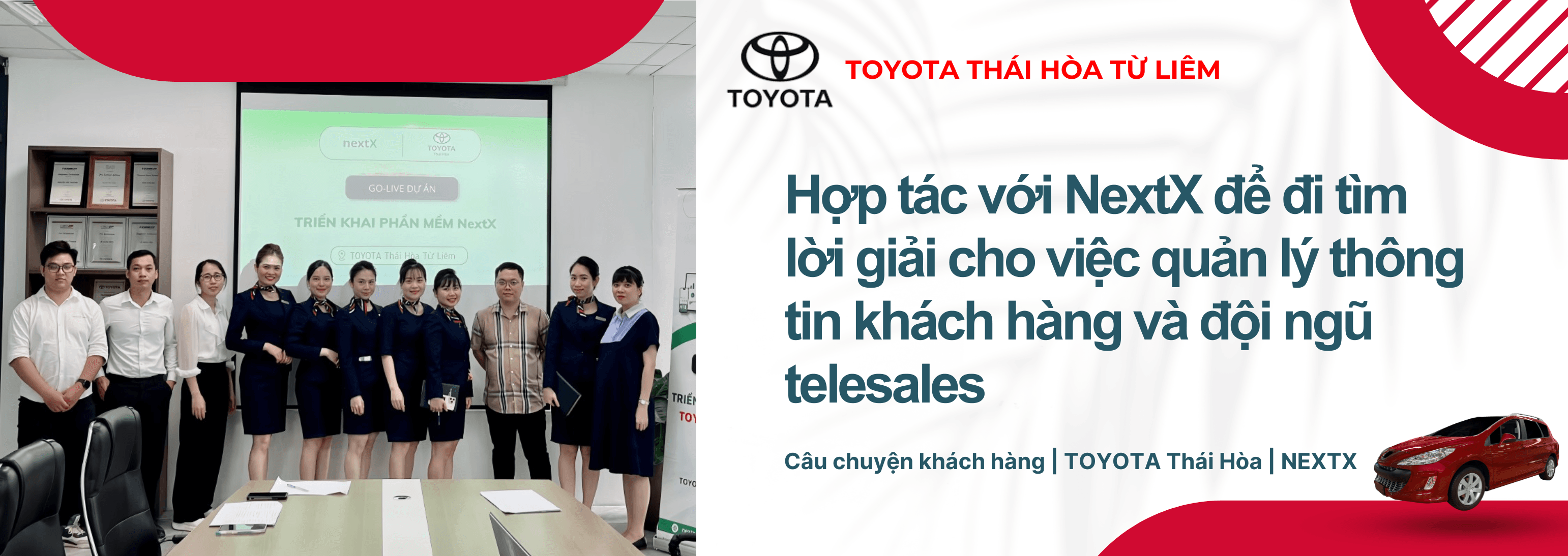 NextX tiếp tục triển khai NextX Call với Toyota Thái Hòa Từ Liêm mục đích để tích hợp tổng đài gọi điện, ghi âm cuộc gọi và lưu trữ thông tin vào hệ thống CRM. Từ khi triển khai phần mềm, Toyota Thái Hòa Từ Liêm đã không còn gặp vấn đề về quản lý chất lượng những cuộc gọi và đội ngũ Telesales của mình. Và đồng thời Toyota Thái Hòa Từ Liêm còn có thể phân tích rõ được đối tượng khách hàng đang mong muốn gì thông qua những cuộc gọi chất lượng đã đạt được.